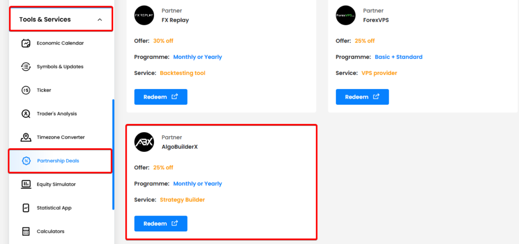 Inside the FTMO User Dashboard, under Tools & Services → Partnership Deals, eligible users can access AlgoBuilderX directly and register with a 25% lifetime discount on all AlgoBuilderX plans.