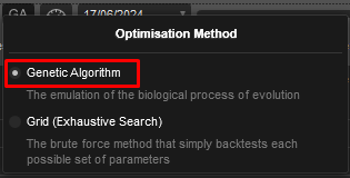 - Using the Optimization Tool: cTrader offers optimization options where users can select either Grid Search (Grid Exhaustive Search) or Random Search ( Genetic Algorithm) as their optimization method.